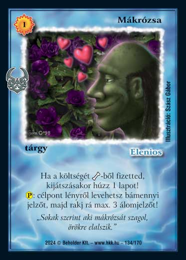Kiadás: Ősi Káosz Gyakoriság: nem gyakori Lapszín (isten): Elenios Típus: tárgy Altípus: - Szöveg: Ha a költségét _*-ből fizetted, kijátszásakor húzz 1 lapot! (P): célpont lényről levehetsz bámennyi jelzőt, majd rakj rá max. 3 álomjelzőt! Szinesítő szöveg: "Sokak szerint aki mákrózsát szagol, örökre elalszik." Illusztráció: Szász Gábor