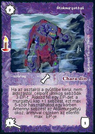 Szöveg: Ha az asztalról a gyűjtőbe kerül, nem áldozástól, célpont játékos sebződik 3 ÉP-t. Áldozd fel egy ÉP-det: a murgattyú kap +1 sebzést, ezt max 5-ször használhatod egy körben. Amennyi sebzést az Átokmurgattyú okoz, annyival csökken az ellenfél max. ÉP-je.