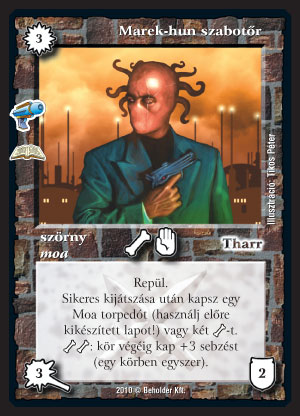Marek-hun szabotőr (7): A mostani moa pakk leggyengébb darabja. Kicsit drágácska; a torpedóval a kijátszási körben semmire se jutunk. Talán a csontos megoldással oda tudunk kanyarintani egy hatost, ami három manáért már nem annyira rossz. De kitehetjük a Moa fényvetőt is, ha úgy gondoljuk, hogy a név kötelez; és minden moa nevű új lapot beleszórunk a frissen összerakott moa paklinkba. Akkor lesz a legjobb, ha már egyébként is összeguberáltunk pár csontot, így a nagy ütés mellett a torpedó is jár. Aki nem hiszi, járjon utána.