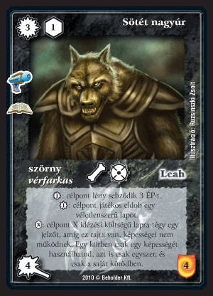 Sötét nagyúr (7): Ez a farkas koma már jóval érdekesebb jelenség. Szép masszív jelenség, nem egyszerű leszedni, és talán még harcban is megállja a helyét. Képességei nem annyira combosak, viszont mindhárom hasznos tud lenni, és ami a legszebb az egészben, hogy ha épp nincs lap, amit meg kéne oldani, akkor az ellenfelet dobathatjuk vele. Lények közül talán csak a kisebbeket irtja ki, de mit kezd pl. egy Kurtz-cal? A képesség semlegesítő jelző már sokkal hasznosabb tulajdonsága, a legtöbb nem-lény lap úgyis elég olcsó, azokra kitűnő lesz. Az, hogy nem esnek le a lapok, problémás lehet, mert feláldozzák, visszaveszik stb., de legalább nem veszik vissza gyűjtőből.