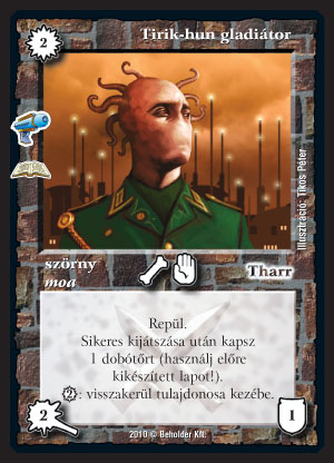 Tirik-hun gladiátor (8): A kedvenc lapom ebből a zénből. Hasznos lény annyi szent. Két manért egy dobótőr és egy kis repülő lény - nem akkora biznisz, de rossznak se lehet mondani. Ami figyelemre ad okot, hogy kettőért visszavehetjük, ideálisan bele lehet csavarni a felhalmozódott manát. Nem mondom, hogy olcsó mulatság lenne, mondjuk egy Tharr bűbája vagy Hívó kürt mellett már viselhető. Tudom, nem egy fegyvergyár, de azért én szeretem.