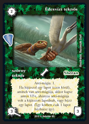 Édesvízi teknős (8): Hasznos jószág. Végre tudjuk alkalmazni az anti-mágiát azokban a pillanatokban is, amikor már rég nincs varázslat az ellenfélnél. A néhány plusz mana nem rossz, de az igazi táp a lap húzása. Az új teknősök miatt érdemes előkapni a paklit és lefújni a port a hajdan büszkén csillogó páncéljukról.