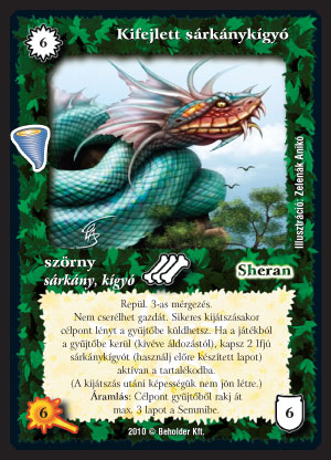 Kifejlett sárkánykígyó (7): A sárkánykígyó család nagy testű tagja. Igazán szép példány, kellemes képességekkel, sajnos az árát is megkéri szolgálataiért. Hat mana manapság már egy hatalmas vagyon, én biztos vagyok benne, hogy nem ez a legjobb mód, ahogy elkölthetjük (azért hozzátenném, hogy ez a legjobb 6 VP-s lap). A költsége talán nem is annyira problémás, én inkább az ár/érték aránnyal nem vagyok annyira elégedett, hisz jószerivel csak a lények ellen tud valamit. Valószínűleg előbb használnék nála egy Méregsárkányt.