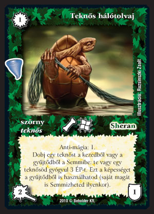 Teknős hálótolvaj (8): Sunyi kis teknősünk valahonnan elcsent egy hálót, de vajon honnan? Azt hiszem ez lényegtelen, fontosabb, hogy birtokolja ezt a hasznos képességet. A teknősökkel az egyik legnagyobb baj úgyis az volt, hogy az ellenfél könnyedén eljátszhatott mellettük, anti-mágiázgatunk egy kicsit, majd jön az ellenfél és kijátszik 10 lapot. Na ilyen most nem lesz. Háló mellett szép lassan a teknős uralmunk kiépülhet. Aztán ne feledkezzünk meg a másik képességéről, a gyógyításról, ami szintén elég nagy hiánypótlás a teki fronton. Ráadásul a gyűjtőből is működik. Kitűnő lap.