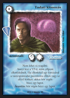 Tudati klónozás (8): Egyértelműen side lap. Az Elmerombolás kitiltása után kicsit gyengült a jelentősége, de még így is befér a kiegészítő pakliba. VP-pusztítás ellen igen jó, hiszen ilyenkor cantrip, de használható a drágító koncepciók (Bűvös erdő, Lassan járj!) ellen is, hiszen ősmágiás. Ha pedig nem tudom éppen semmire használni, akkor ott az áramlása.